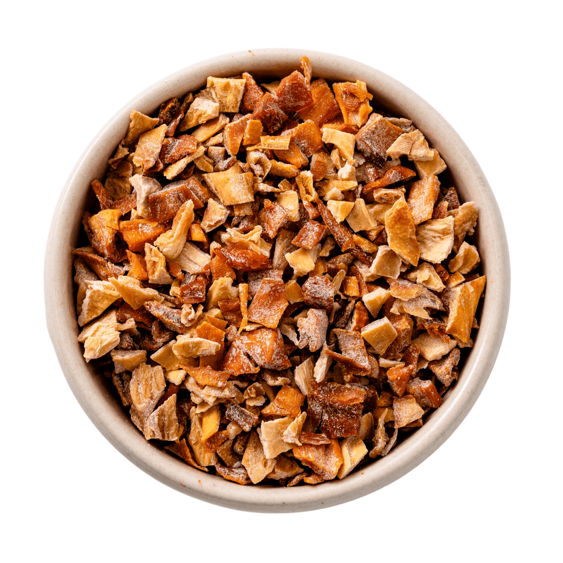 Mangue séchée et coupée en dés. Les cubes de couleur orange clair à foncé mesurent environ 5 x 5 à 10 x 10 mm et ont une consistance mi-ferme à ferme. L'agent de séparation est de la farine de riz (environ 5%). Ces cubes délicieusement sucrés et riches en fibres sont parfaits pour les mueslis et autres mélanges, ainsi que pour la cuisine et la pâtisserie.