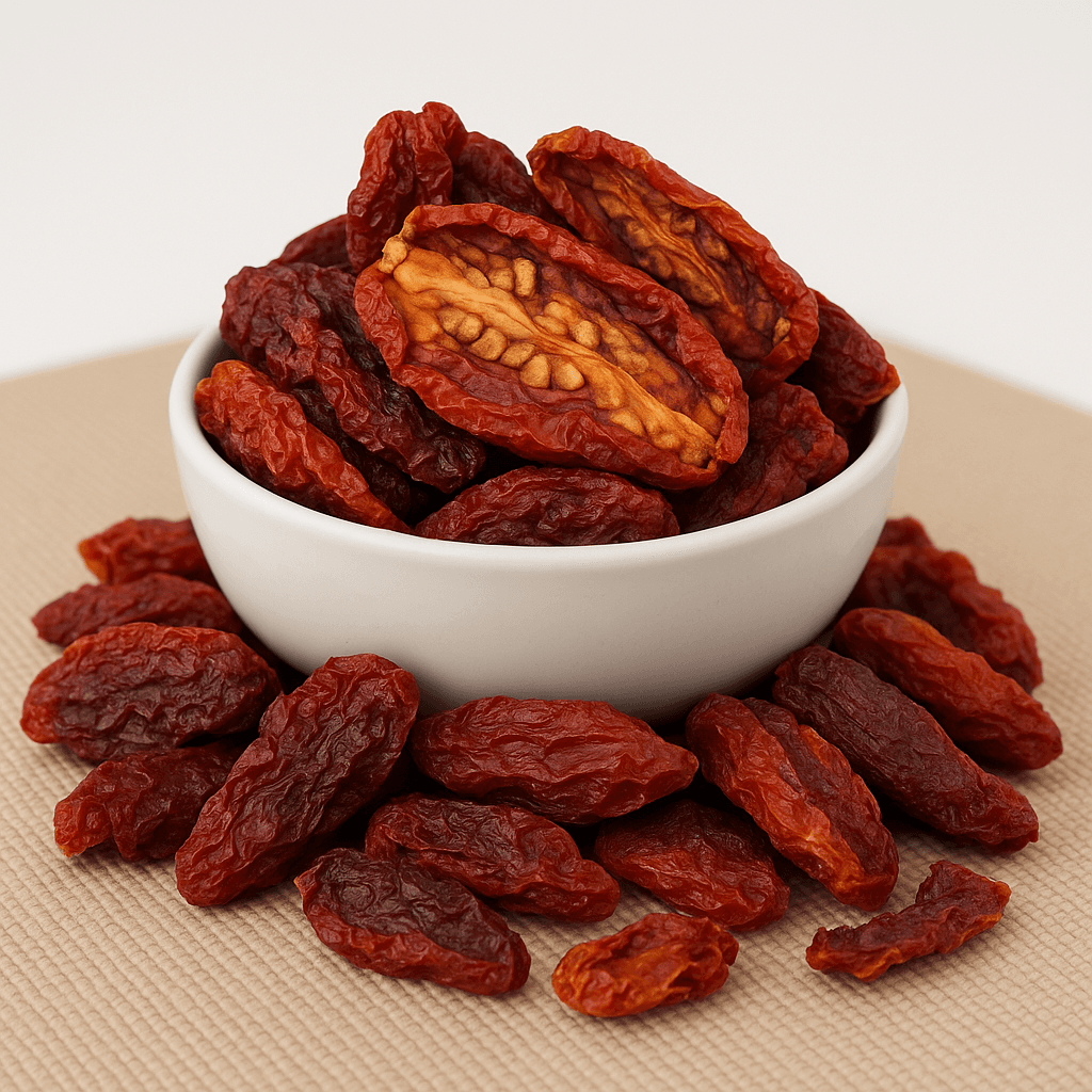 Moitiés de tomates séchées au soleil, de couleur rouge à brun foncé. Elles ont un goût salé et fruité et sont une source de fibres. Ces tomates sont idéales pour les plats méditerranéens comme les pâtes et le risotto, les salades ou pour être marinées dans l'huile.